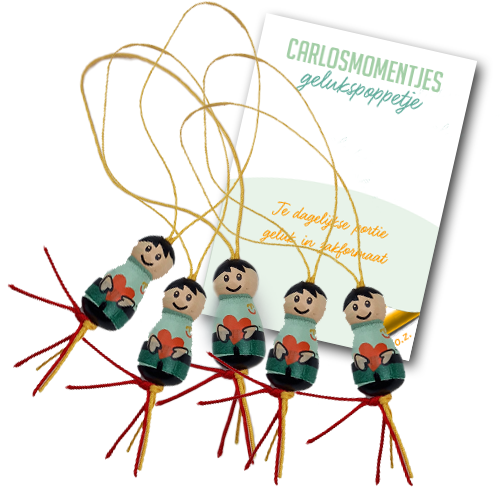 Het creëren en delen van mooie momenten kan zo gemakkelijk zijn. Dat bewijzen ook deze superleuke gelukspoppetjes. Speciaal ontworpen voor Stichting Carlosmomentjes en met liefde handgemaakt. Om te geven aan iemand die je bewondert of die je lief hebt. Aan iemand die wel een steuntje in de rug of dikke knuffel kan gebruiken. Of zomaar, omdat het nu eenmaal leuk is om geluk weg te geven. Ze zijn verpakt per 5 stuks en komen graag jouw kant op!